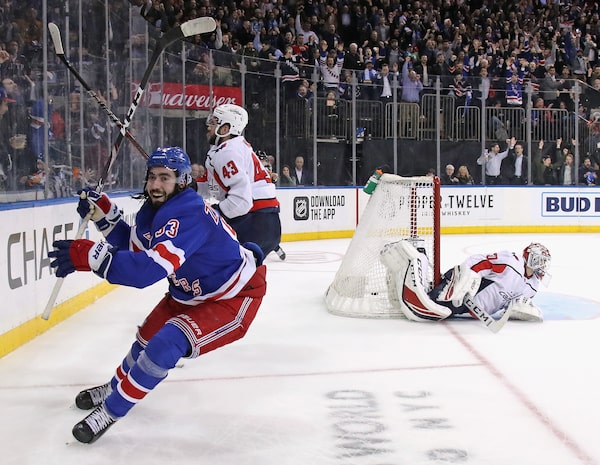 Mika Zibanejad scores his fifth goal of the game in overtime to beat Ilya Samsonov and the Washington Capitals 5-4 at Madison Square Garden on March 5, 2020.BRUCE BENNETT/Getty Images