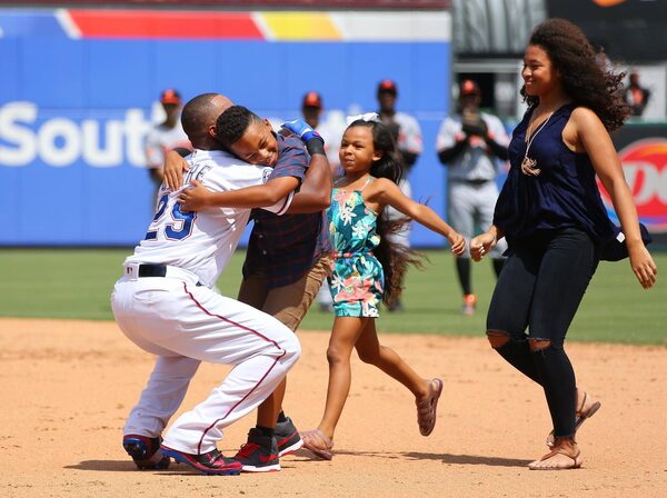 Adrian Beltre #29 of the Texas Rangers hugs his son Adrian Jr. as Canila and Cassandra looks on in the fourth inning against the Baltimore Orioles at Globe Life Park in Arlington on July 30, 2017 in Arlington, Texas.Rick Yeatts/Getty Images