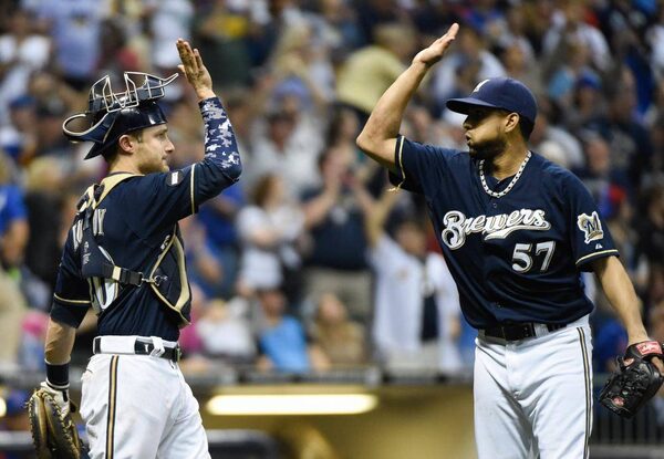 FILE - In this Sept. 27, 2014, file photo, Milwaukee Brewers catcher Jonathan Lucroy, left, and pitcher Francisco Rodriguez celebrate after the Brewers beat the Chicago Cubs 2-1 in Milwaukee.Benny Sieu/The Associated Press