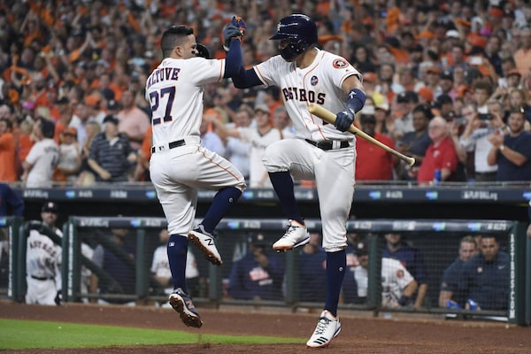 Houston Astros' Jose Altuve celebrates his solo home run against the Boston Red Sox with teammate Carlos Correa during Game 1 of the American League Division Series in Houston, on Oct. 5, 2017.Eric Christian Smith/The Associated Press