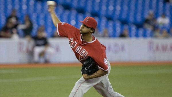 Los Angeles Angels starting pitcher Ervin Santana works against Toronto Blue Jays during second inning AL action in Toronto on Sunday April 18 2010.CHRIS YOUNG/The Canadian Press