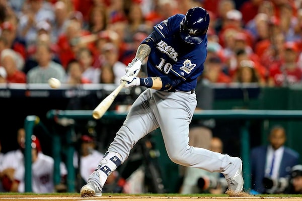 Milwaukee Brewers catcher Yasmani Grandal hits a two-run home run during the first inning of the wild-card game against the Washington Nationals.The Associated Press