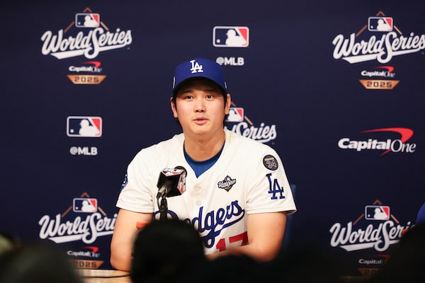 Los Angeles Dodgers two-way player Shohei Ohtani speaks at the postgame press conference after Game 4 of the World Series at Dodger Stadium.Kiyoshi Mio/Reuters