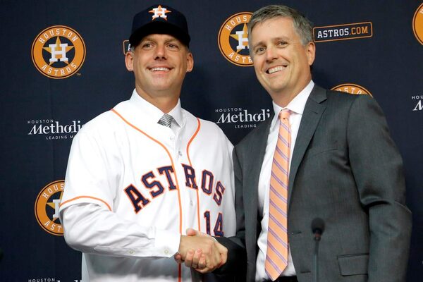 In this Sept. 29, 2014, file photo, Houston Astros general manager Jeff Luhnow, right, and A.J. Hinch pose after Hinch is introduced as the new manager of the baseball club in Houston.The Associated Press