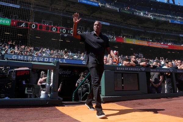 Barry Bonds acknowledges the crowd during a ceremony for players that are part of the Pittsburgh Pirates 2024 Hall of Fame class before a game against the Cincinnati Reds in Pittsburgh on Aug. 24, 2024.Barry Reeger/The Associated Press