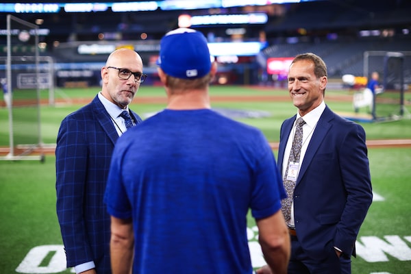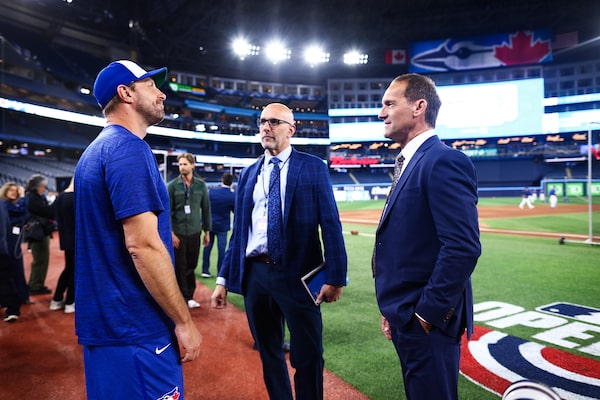 Siddall, a former catcher, at right, chats with Blue Jays pitcher Max Scherzer alongside colleague Dan Shulman during batting practice ahead of the Jays' home opener this season.Cole Burston/The Globe and Mail