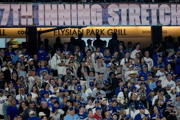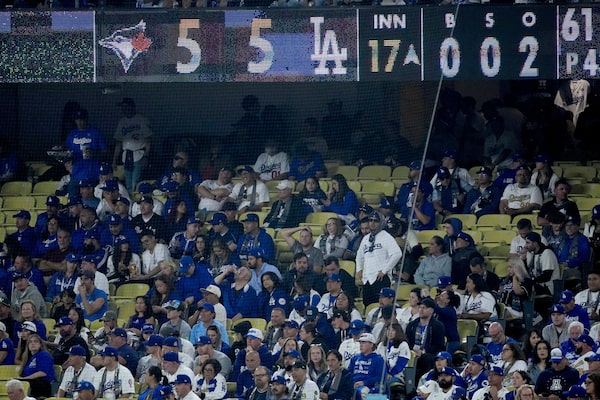 Fans stand during the 14th inning. Jays fans had their hearts broken by a walk-off home run for the Dodgers in the 18th.Ashley Landis/The Associated Press