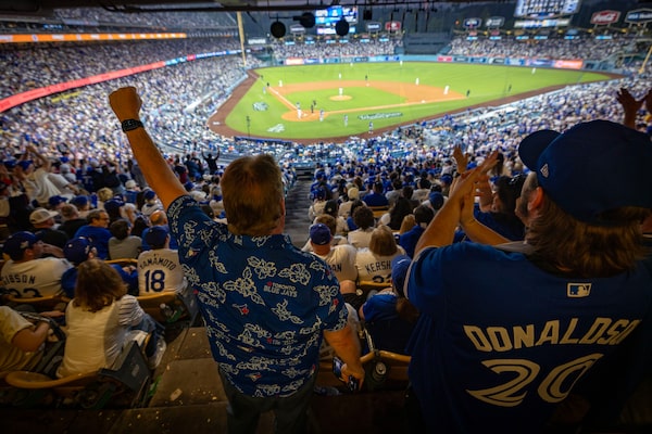 Fans cheer on the Blue Jays during a marathon Game 3 of the World Series at Dodger Stadium on Monday.Barbara Davidson/The Globe and Mail