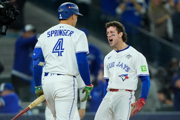 Toronto Blue Jays third baseman Ernie Clement, right, celebrates with George Springer after scoring in the sixth inning during Game 7 of the 2025 World Series at Rogers Centre.John E. Sokolowski/Reuters