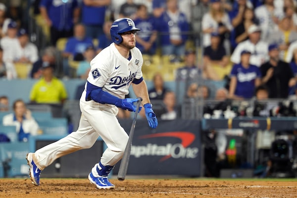 Max Muncy of the Dodgers hits a double in the ninth inning. The World Series will return to Canada on Friday.Ronald Martinez/Getty Images