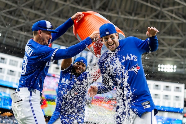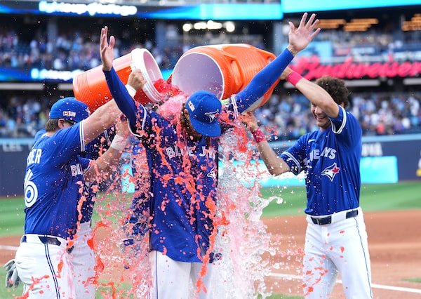 Blue Jay Ernie Clement gets water dumped on him by Vladimir Guerrero Jr. and Mark Budzinski after defeating the Tampa Bay Rays at Rogers Centre on Saturday.Kevin Sousa/Reuters