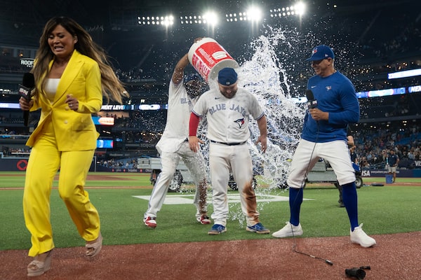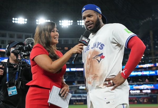 After the Toronto Blue Jays clinched the American League championship last week, she waded into a gale-force celebration with a ball cap pulled down tight on her head. With years of experience, Sportsnet’s on-field Blue Jays reporter doesn’t bother wearing a poncho or a raincoat. Her clothes get soaked anyway.