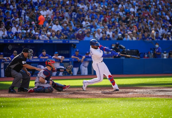 Toronto Blue Jays' Teoscar Hernandez hits a three run home run against the Minnesota Twins, at the Rogers Centre, in Toronto, on Sept. 18.Mark Blinch/Getty Images