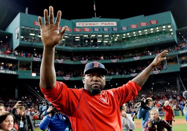 In this Oct. 10, 2016, file photo, Boston Red Sox's David Ortiz waves from the field at Fenway Park after Game 3 of the ALDS against the Cleveland Indians in Boston.The Associated Press