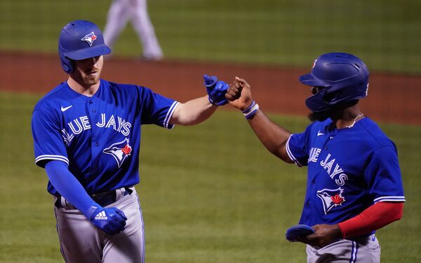 Toronto Blue Jays center fielder Derek Fisher (23) (left) is congratulated after hitting a two-run home run to take the lead against the Boston Red Sox in the ninth inning at Fenway Park in Boston on July 21, 2020.David Butler II/USA TODAY Sports via Reuters