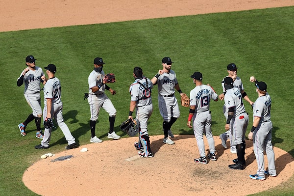The Miami Marlins celebrate following their victory over the Philadelphia Phillies at Citizens Bank Park on July 26, 2020.James Lang/USA TODAY Sports via Reuters