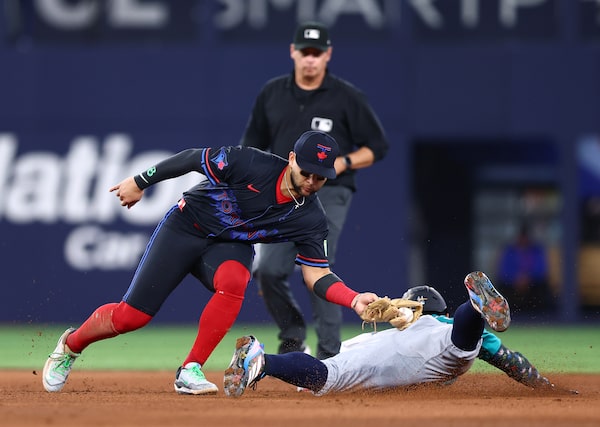 Julio Rodríguez of the Seattle Mariners is tagged out by Bo Bichette of the Toronto Blue Jays at second base in the eighth inning at Rogers Centre. The Jays won 3-1 on April 18, 2025, in Toronto.Vaughn Ridley/Getty Images