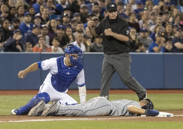 Tampa Bay Rays' Austin Meadows tumbles face down into third base after being tagged out in a run-down with Toronto Blue Jays catcher Luke Maile in the sixth inning of their American League MLB baseball game in Toronto on Saturday, April 13, 2019. THE CANADIAN PRESS/Fred ThornhillFred Thornhill/The Canadian Press