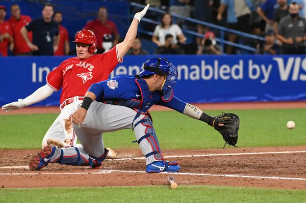 Toronto Blue Jays third baseman Matt Chapman slides safely into home plate ahead of a tag by Chicago Cubs catcher Willson Contreras on a walk-off single by Danny Jansen in 11th inning in Toronto. The Jays won 5-4 on Aug. 29, 2022.Jon Blacker/The Canadian Press