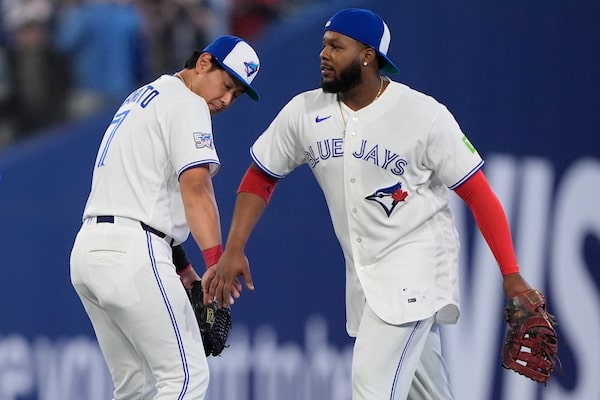 Blue Jays third baseman Kazuma Okamoto, left, and first baseman Vladimir Guerrero Jr. celebrate a win over the Athletics at Rogers Centre on Sunday. The Jays are 3-0 to start a season for the first time since 1996.John E. Sokolowski/Reuters