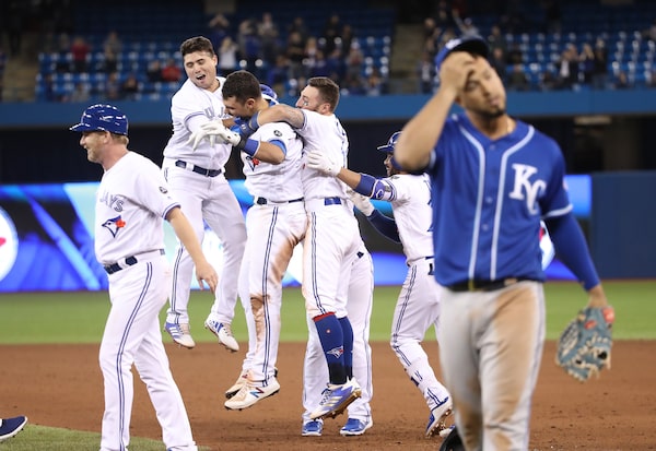 Toronto Blue Jays' Luke Maile is congratulated on his game-winning RBI at the Rogers Centre, in Toronto, on April 17, 2018.Tom Szczerbowski/Getty Images