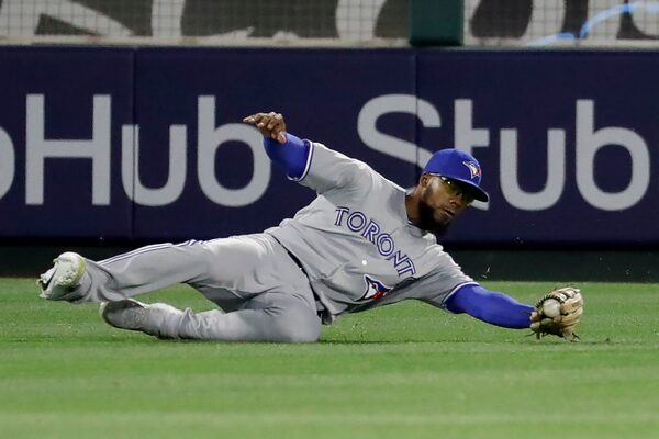 Toronto Blue Jays left fielder Teoscar Hernandez catches a fly ball hit by Los Angeles Angels' Mike Trout during the eighth inning of a game in Anaheim, Calif., on Tuesday, April 30, 2019.Chris Carlson/The Associated Press