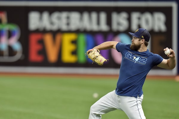 Tampa Bay Rays relief pitcher Jalen Beeks warms up near a 'Baseball is for Everyone' banner on the right field wall before a game against the Minnesota Twins, in St. Petersburg, Fla., on June 7.Chris O'Meara/The Associated Press