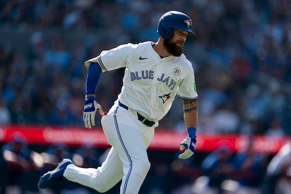 The Toronto Blue Jays, Nathan Lukes runs to first base on a RBI double against the St. Louis Cardinals during eighth inning interleague MLB baseball action in Toronto, on Sept. 15.Paige Taylor White/The Canadian Press