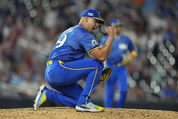 Minnesota Twins relief pitcher Jhoan Duran celebrates after forcing the final out to defeat the Toronto Blue Jays 2-0 on Aug. 30, 2024, in Minneapolis.Abbie Parr/The Associated Press