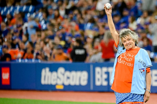 Dolores Naponse, 72, an Indigenous elder, advocate and residential school survivor from the Atikameksheng Anishnawbek First Nation, near Sudbury, threw out the first pitch. She is a survivor of both the Whitefish Lake Indian Day School and the Spanish Residential School for girls.