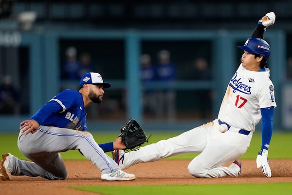 Ohtani is tagged out by Toronto Blue Jays shortstop Isiah Kiner-Falefa after an attempted steal during the ninth inning in Game 3 of the World Series on Monday in Los Angeles.Brynn Anderson/The Associated Press