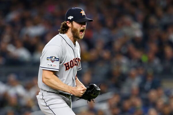 Gerrit Cole of the Houston Astros celebrates retiring the side during the sixth inning against the New York Yankees in Game 3 of their ALCS on Oct. 15, 2019, in New York. Cole, who led the majors with 326 strikeouts and topped the AL with a 2.50 ERA, is set to throw the first pitch on Tuesday night in Houston.Mike Stobe/Getty Images