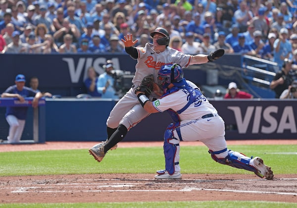 Baltimore Orioles left fielder Austin Hays (21) is tagged out at home plate by Toronto Blue Jays catcher Alejandro Kirk (30) during the second inning at the Rogers Centre.Nick Turchiaro/Reuters