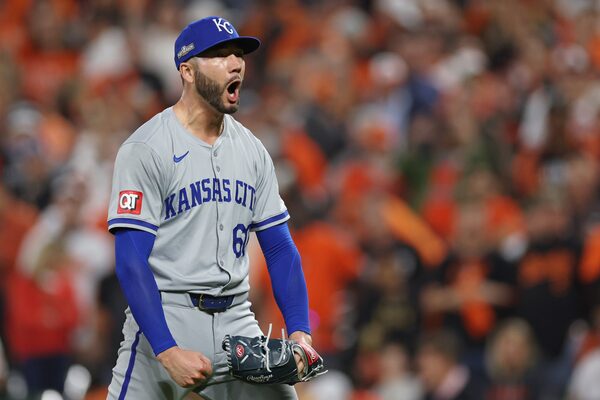 Lucas Erceg of the Kansas City Royals celebrates after striking out Gunnar Henderson of the Baltimore Orioles to win Game 2 of the Wild Card Series 2-1 at Oriole Park at Camden Yards on Oct. 2, 2024 in Baltimore, Maryland.Patrick Smith/Getty Images