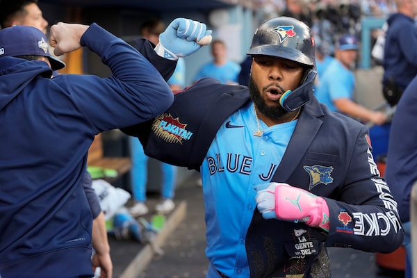 The Jays' Vladimir Guerrero Jr. celebrates his home run during the first inning in Game 5.Ashley Landis/The Associated Press