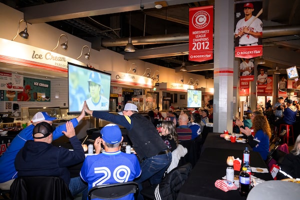 Season ticket holders of the Blue Jays affiliate team, the Vancouver Canadians, attend a watch party at Nat Bailey Stadium for Game 1.Jennifer Gauthier/The Globe and Mail