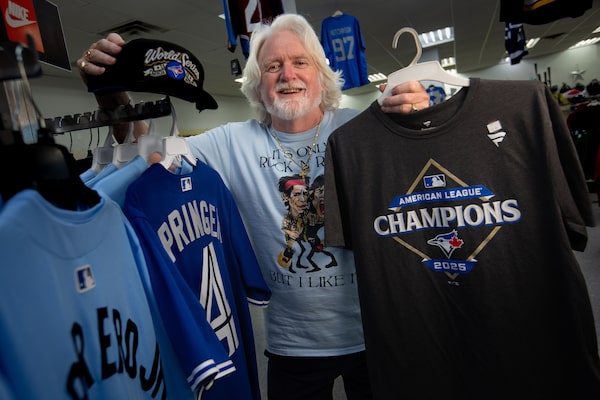 Brothers Jason, Ryan and Brandon, along with their father, Michael Boyer, celebrate the Jays' Game 5 victory.Barbara Davidson/The Globe and Mail