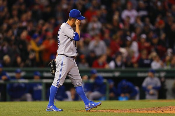 Marco Estrada of the Toronto Blue Jays reacts after walking Mookie Betts of the Boston Red Sox during the fifth inning at Fenway Park on April 28, 2015 in Boston, Massachusetts.Maddie Meyer/Getty Images