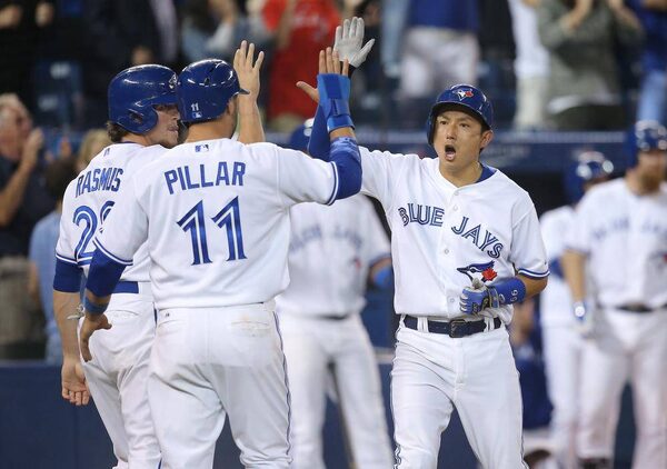 Munenori Kawasaki #66 of the Toronto Blue Jays celebrates with Kevin Pillar #11 and Colby Rasmus #28 after they alls cored on a bases-clearing double in the ninth inning during MLB game action against the Chicago Cubs on September 9, 2014 at Rogers Centre in Toronto, Ontario, Canada.Tom Szczerbowski/Getty Images