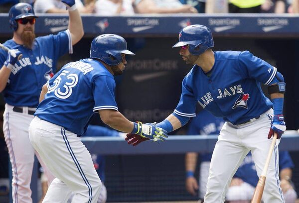 Toronto Blue Jays Melky Cabrera, left, and Jose Bautista celebrate Cabrera's solo home run in the sixth inning of MLB baseball action against the New York Yankees at the Rogers Centre in Toronto on Sunday, August 31, 2014.Darren Calabrese/The Canadian Press