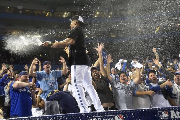The Toronto Blue Jays’ Ben Revere sprays fans with champagne as they celebrate the team’s win over the Texas Rangers to take the American League Division Series at Rogers Centre on Wednesday.Fred Lum/The Globe and Mail