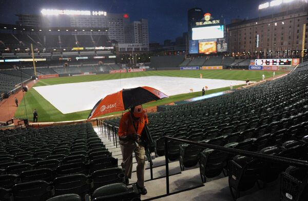 Gray skies hovered over Baltimore for most of the afternoon and a steady rain began to fall a couple of hours before the scheduled first pitch of the game between the Blue Jays and the Baltimore Orioles.