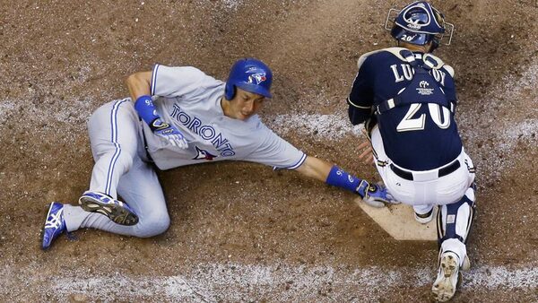 Milwaukee Brewers catcher Jonathan Lucroy can't handle the throw as Toronto Blue Jays' Munenori Kawasaki slides safely home during the sixth inning of a baseball game Wednesday, Aug. 20, 2014, in Milwaukee.The Associated Press