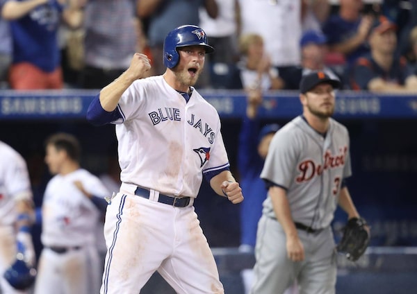 Michael Saunders celebrates as he scores the go-ahead run in the eighth inning during against the Detroit Tigers on July 7, 2016 at Rogers Centre.Tom Szczerbowski/Getty Images