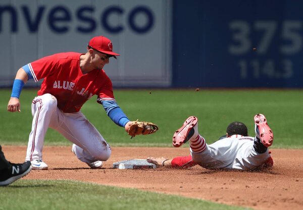 Mookie Betts #50 of the Boston Red Sox steals second base in the second inning during MLB game action as Troy Tulowitzki #2 of the Toronto Blue Jays applies the late tag at Rogers Centre on July 2, 2017 in Toronto, Canada.Tom Szczerbowski/Getty Images