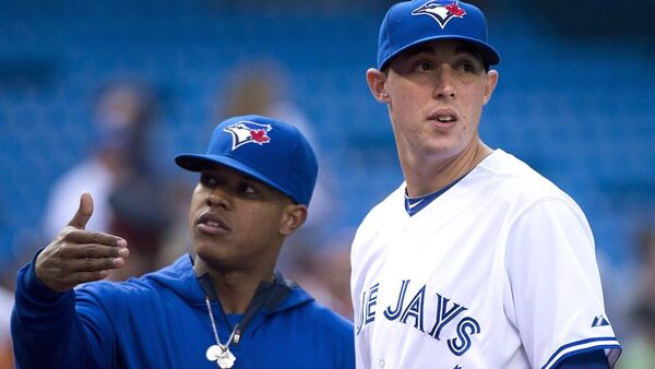 Toronto Blue Jays pitchers Marcus Stroman, left, and Aaron Sanchez talk before the Blue Jays take on the Boston Red Sox during first inning AL baseball action in Toronto on Tuesday, July 22, 2014.The Canadian Press