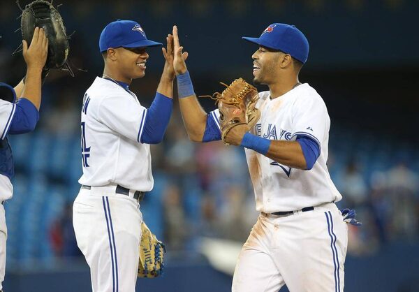 Dalton Pompey of the Toronto Blue Jays celebrates their victory with Marcus Stroman during MLB game action against the Baltimore Orioles on September 26, 2014 at Rogers Centre in Toronto.Tom Szczerbowski/Getty Images