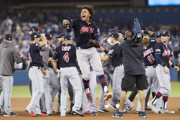 Cleveland Indians shortstop Francisco Lindor celebrates after defeating the Toronto Blue Jays in game five American League Championship Series baseball action in Toronto on Wednesday, October 19, 2016.Mark Blinch/The Canadian Press