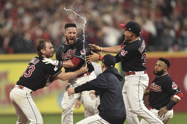 Cleveland Indians catcher Yan Gomes is congratulated by pitcher Josh Tomlin for his game-winning RBI-single during the 13th inning in Game 2 of the 2017 ALDS against the New York Yankees at Progressive Field.Ken Blaze