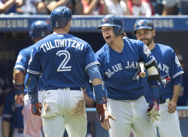 Toronto Blue Jays' Josh Donaldson, right, is all smiles for teammate Troy Tulowitzki after he came into score in the second inning of their American League MLB baseball game against the Detroit Tigers in Toronto on July 10, 2016.Fred Thornhill/The Canadian Press